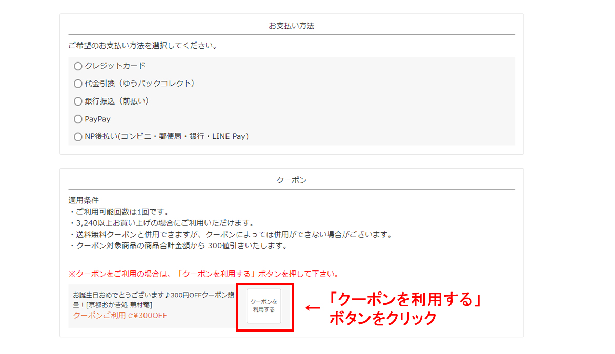 「クーポンを利用する」ボタンをクリックすると、クーポン値引き-300が反映されます。