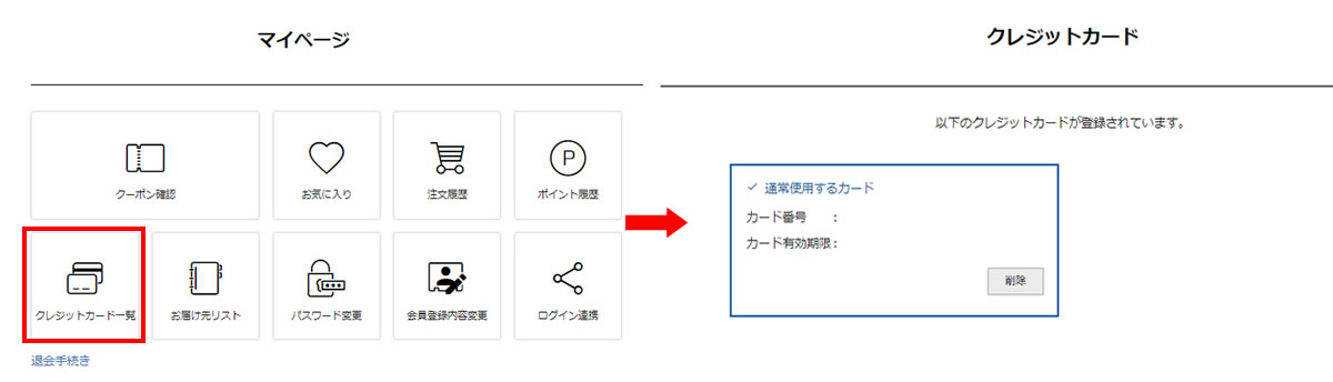 登録したクレジットカードは、マイページから編集・削除できます。(定期・頒布会販売に利用されているクレジットカードのみ編集できます。)
